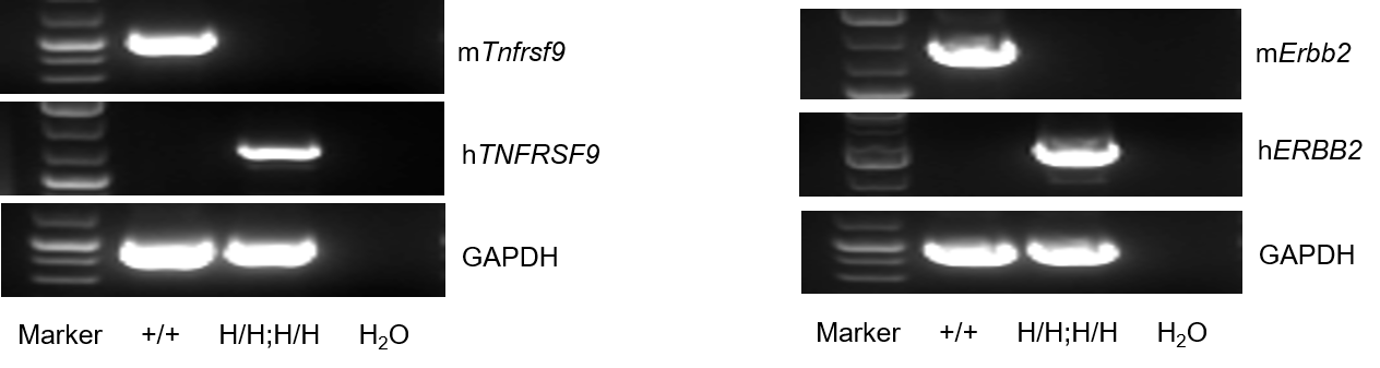 Strain specific analysis of 4-1BB (TNFRSF9) and HER2 (ERBB2) gene expression in wild-type mice and B-h4-1BB/hHER2 mice by RT-PCR. Mouse Tnfrsf9 mRNA was detectable only in spleen of wild-type mice (+/+). Human TNFRSF9 mRNA was detectable only in spleen of homozygous B-h4-1BB/hHER2 mice (H/H;H/H), but not in wild-type mice. Mouse Erbb2 mRNA was detectable only in liver of wild-type mice (+/+). Human ERBB2 mRNA was detectable only in liver of homozygous B-h4-1BB/hHER2 mice (H/H;H/H), but not in wild-type mice.