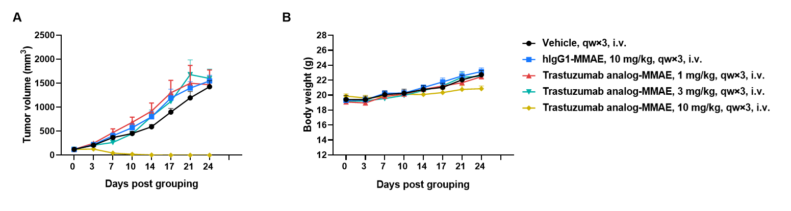 Antitumor activity of anti-human HER2 ADC (Trastuzumab analog-MMAE, in-house) in B-h4-1BB/hHER2 mice. (A) Anti-human HER2 ADC inhibited B-hHER2 MC38 plus tumor growth in B-h4-1BB/hHER2 mice. Murine colon cancer B-hHER2 MC38 plus cells were subcutaneously implanted into homozygous B-h4-1BB/hHER2 mice (female, 8-week-old, n=6). Mice were grouped when tumor volume reached approximately 100-150 mm3, at which time they were intravenously injected with anti-human HER2 ADC Trastuzumab analog-MMAE (in-house) indicated in panel. (B) Body weight changes during treatment. As shown in panel A, 10mg/kg anti-human HER2 ADC was efficacious in controlling tumor growth in B-h4-1BB/hHER2 mice, demonstrating that B-hHER2 MC38 plus provide a powerful preclinical model for in vivo evalsuation of anti-human HER2 ADC. Values are expressed as mean ± SEM.