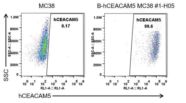 CEACAM5 expression analysis in B-hCEACAM5 MC38 cells by flow cytometry. Single cell suspensions from wild-type MC38 and B-hCEACAM5 MC38 #1-H05 cultures were stained with anti-CEACAM5 antibody (Biolegend, 342308). Human CEACAM5 were detected on the surface of B-hCEACAM5 MC38 cells but not wild-type MC38 cells.