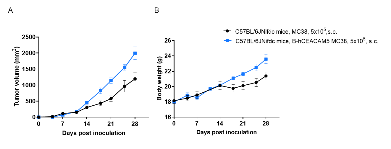 Subcutaneous tumor growth of B-hCEACAM5 MC38 cells. B-hCEACAM5 MC38 (5x105) and wild-type MC38 cells (5x105) were subcutaneously implanted into C57BL/6JNifdc (7-week-old, n=6). Tumor volume and body weight were measured twice a week. (A) Average tumor volume. (B) Body weight. Volume was expressed in mm3 using the formula: V=0.5 X long diameter X short diameter2. Results indicated that B-hCEACAM5 MC38 cells were able to establish tumors in vivo and could be used for efficacy studies. Values are expressed as mean ± SEM.