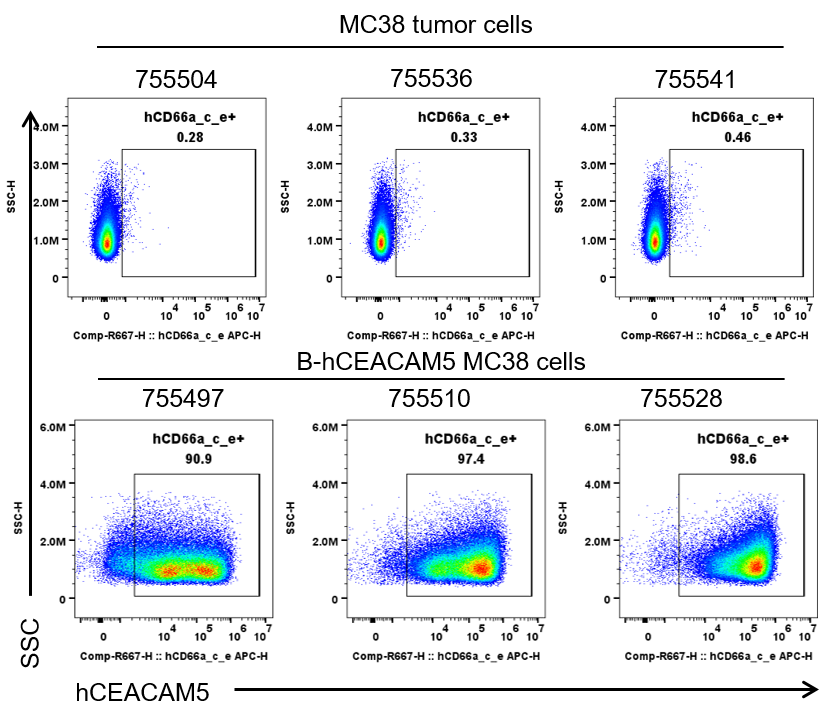 CEACAM5 expression evalsuated on B-hCEACAM5 MC38 cells by flow cytometry. B-hCEACAM5 MC38 cells were subcutaneously transplanted into C57BL/6JNifdc (n=6). Upon conclusion of the experiment, tumor cells were harvested and analyzed with anti-human CEACAM5 antibody (Biolegend, 342308) by flow cytometry. Therefore, B-hCEACAM5 MC38 cells can be used for in vivo efficacy studies evalsuating novel CEACAM5 therapeutics.