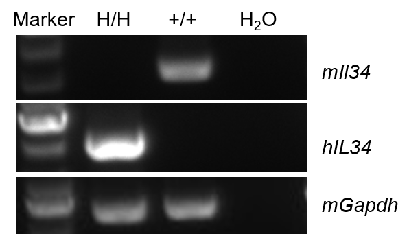 Species specific analysis of IL34 gene expression in wild-type B-NDG mice and homozygous humanized B-NDG hIL34 mice by RT-PCR. Splenocytes were collected from wild-type B-NDG mice (+/+) and homozygous B-NDG hIL34 mice (H/H). Mouse IL34 mRNA was only detectable in wild-type B-NDG mice. Human IL34 mRNA was only detectable in homozygous B-NDG hIL34 mice, but not in wild-type B-NDG mice.
