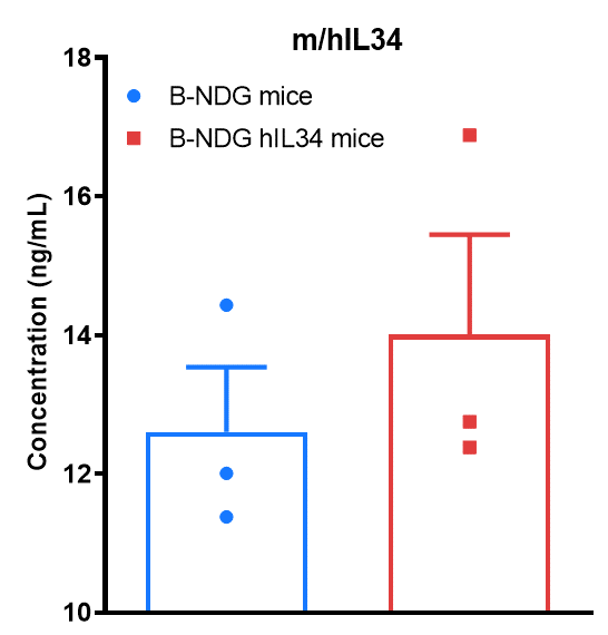 - Human IL34 was only detectable in B-NDG hIL34 mice.