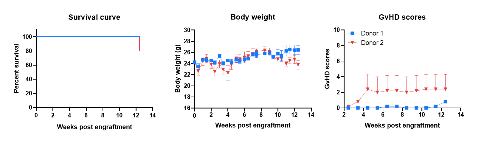 B-NDG hIL15, MHC I/II DKO ad mice has a long life span and reduced severity of GvHD when engrafted with human PBMCs. B-NDG hIL15, MHC I/II DKO ad mice were engrafted intravenously with human PBMCs (1×107) on day 0 (n=5). Survival rates of the mice were analyzed with Kaplan Meier survival curves. Body weight was measured twice a week. Clinical signs of GvHD were scored once a week. Euthanasia was implemented when the body weight decreased more than 20%. Meanwhile, the GvHD score of the mouse was recorded as 10. Values were expressed as mean ± SEM.