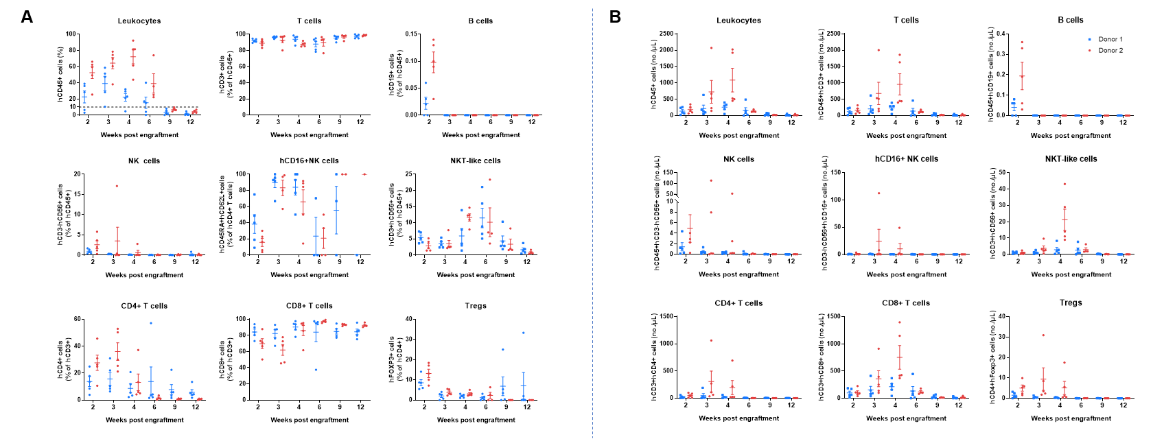 Human PBMCs were successfully reconstituted in B-NDG hIL15, MHC I/II DKO ad mice. B-NDG hIL15, MHC I/II DKO ad mice were engrafted intravenously with human PBMCs (1×107) from two donors on day 0 (n=5). Peripheral blood was taken to analyze the reconstitution level of human immune cells. A. Frequency of reconstituted human immune cells; B. Absolute cell number of reconstituted human immune cells. The results showed that two weeks after the reconstitution of human PBMCs in B-NDG hIL15, MHC I/II DKO ad mice, the frequency and absolute cell number of CD45+ cells in peripheral blood began to increase. The frequency of reconstituted human T cells exceeded 90% from three weeks and continued to rise, eventually reaching nearly 100%. Reconstituted human T cells include CD4+T cells, CD8+T cells and Tregs. A small amount of NK cells and NKT-like cells can also be detected. Values were expressed as mean ± SEM.